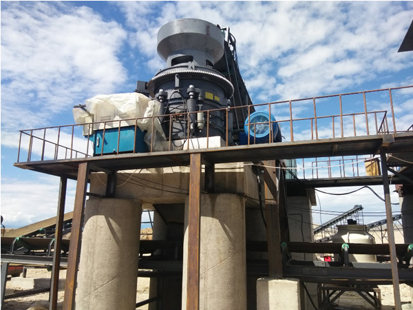 多缸液壓圓錐式破碎機(jī)工作時(shí),電機(jī)通過皮帶輪和三角帶帶動(dòng)設(shè)備傳動(dòng)軸轉(zhuǎn)動(dòng),傳動(dòng)軸通過傘狀錐齒輪嚙合帶動(dòng)偏心套繞主軸轉(zhuǎn)動(dòng),偏心套驅(qū)動(dòng)動(dòng)錐部位做旋擺運(yùn)動(dòng),連續(xù)不斷地對(duì)物料進(jìn)行擠壓、搓碾。物料受到多個(gè)方向的作用力,沿著自身紋理破碎并被打磨,形成抗壓強(qiáng)度較高的建筑骨料,符合出料要求的從破碎壁旋擺間隙處排出,其余物料繼續(xù)破碎,直至達(dá)到終要求。