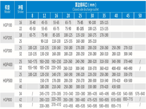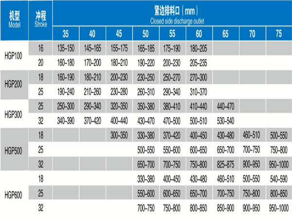 不同腔形、沖程,適用的排料口范圍不同,從主參數(shù)表中找出允許排料口大小并與生產(chǎn)能力的參考結(jié)合,最大排料會在破碎壁和軋臼壁磨損后變大。